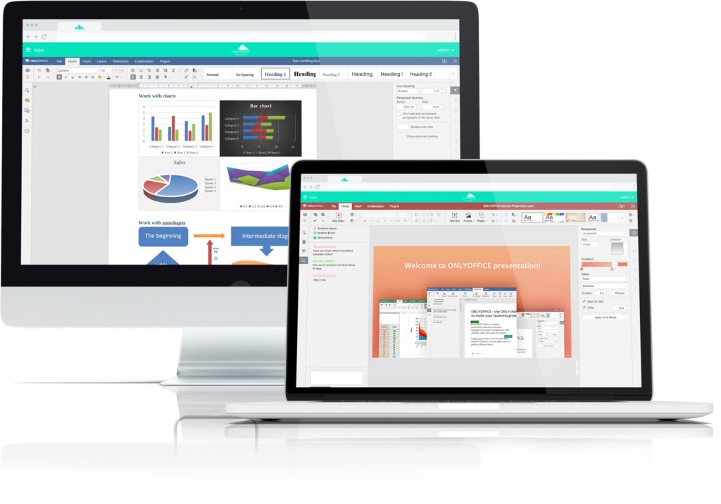 Die ONLYOFFICE-Integration ermöglicht die gemeinsame Bearbeitung von Dokumenten in Echtzeit. Mit cleveren Bearbeitungs- und Designtools ist jede Text- und Absatzformatierung möglich. Schreiben Sie an Geschäftsdokumenten, bearbeiten Sie komplexe Tabellenkalkulationen oder halten Sie beeindruckende Präsentationen. Mit integriertem Chat, Kommentarfunktionen, Change Tracking, integriertem Übersetzer, Sprachausgabe und vielem mehr stehen Ihnen umfangreiche Optionen zur Verfügung um herausragende Arbeit zu leisten.